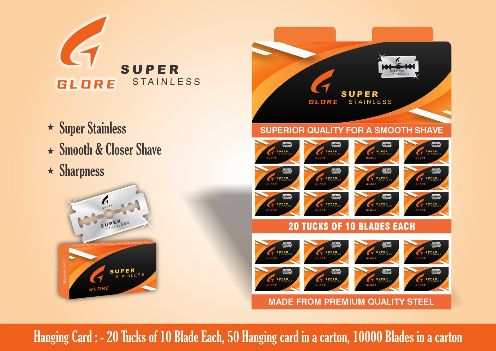 Double-Edge Stainless Steel Blade, Packed in 20 Tucks of 10 Blades, Hanging Card Display