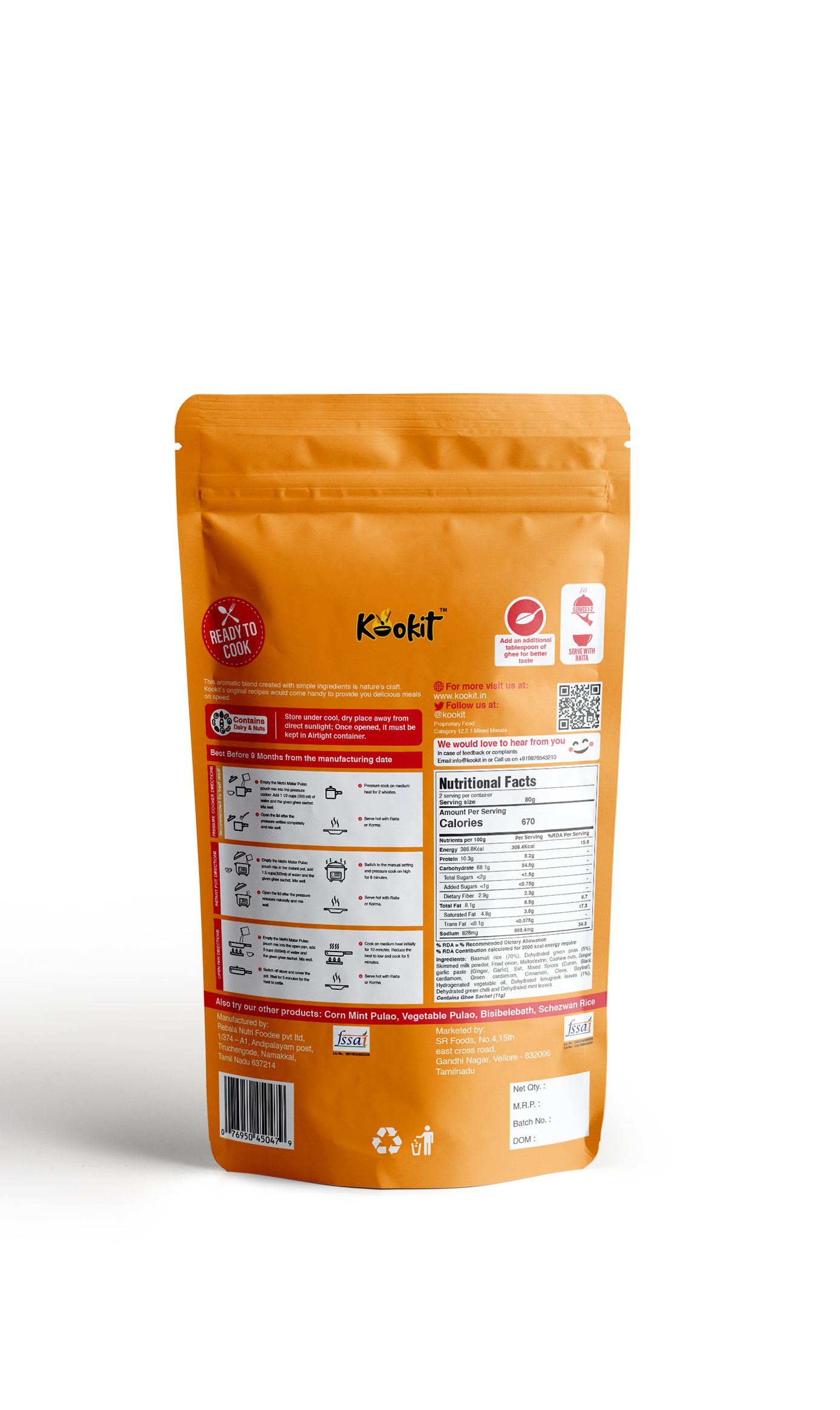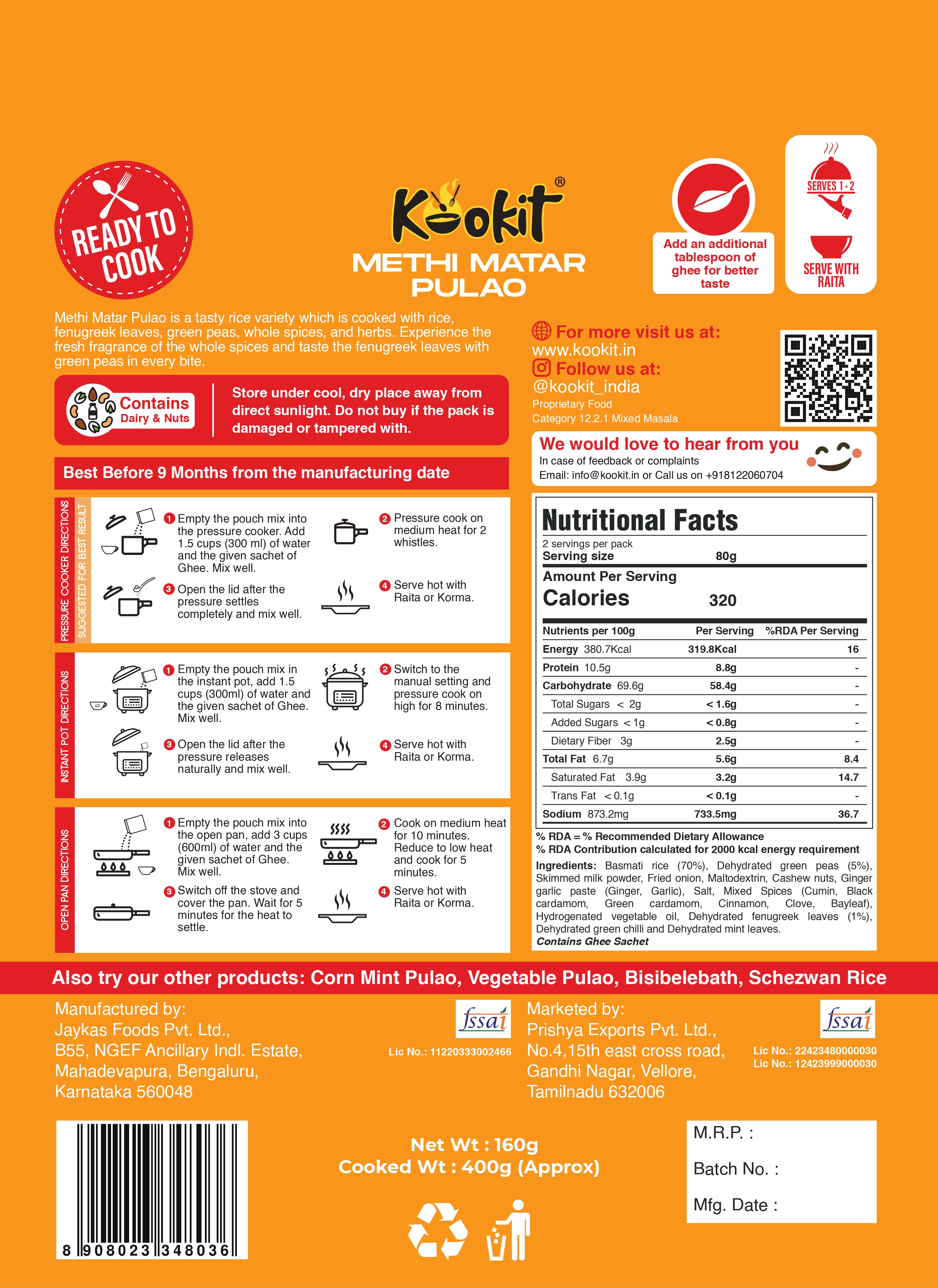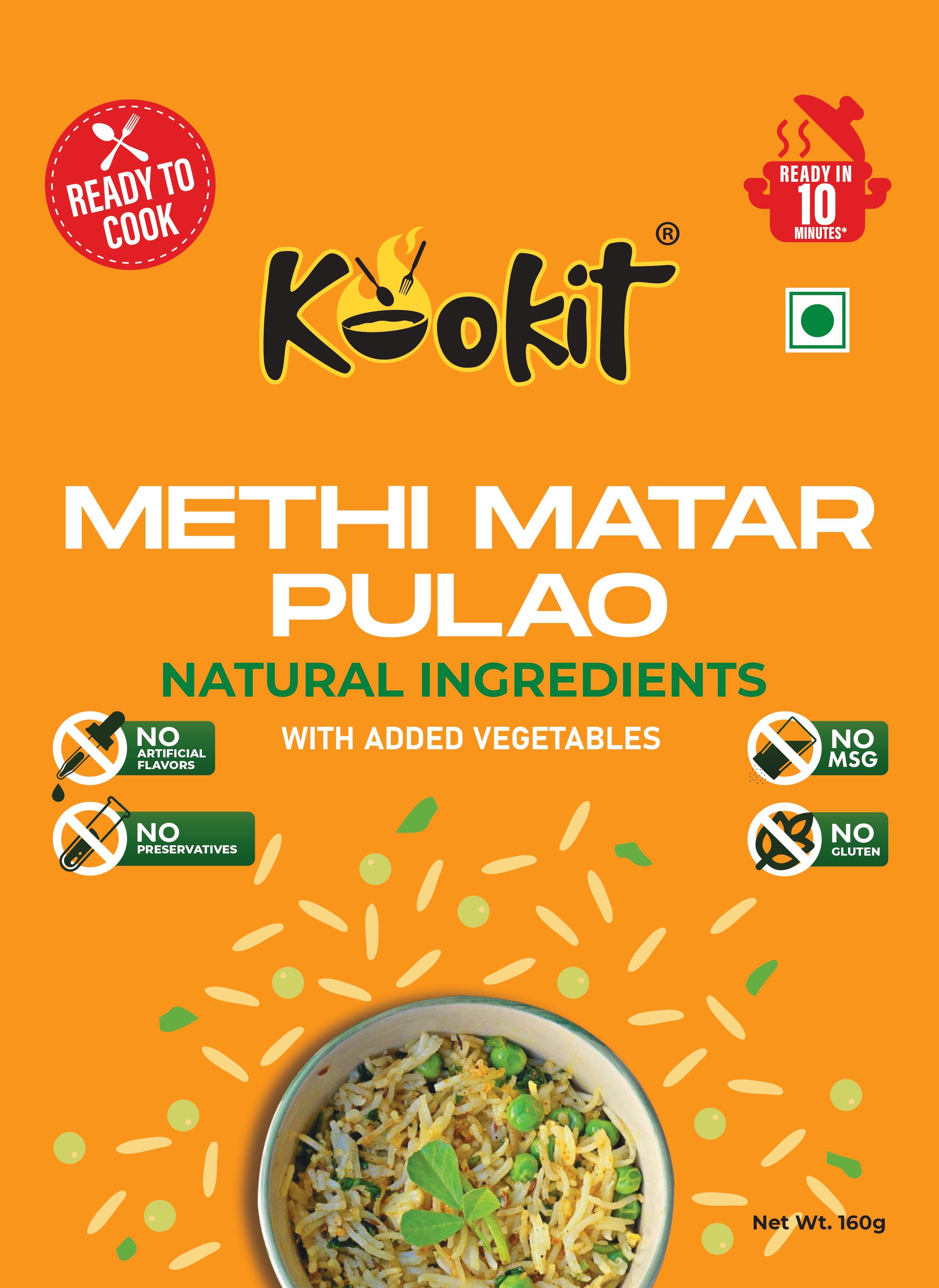 Kookit Methi Matar Pulao 160gms - Instant Food - Ready to Cook Premix - Natural Ingredients - No Artificial Flavours - No Preservatives - No MSG and Gluten - Ready in 10 mins