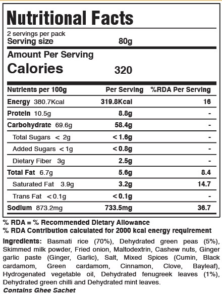 Other Specification :Includes Ghee Sachet - Premix includes Rice, Vegetables, Spices and Masala Blend - Just add water and boil